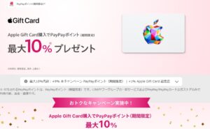 このキャンペーンでは、Apple Gift CardをYahoo!ショッピング内の対象ストアで購入すると、最大10%のPayPayポイント(期間限定)が付与されます。